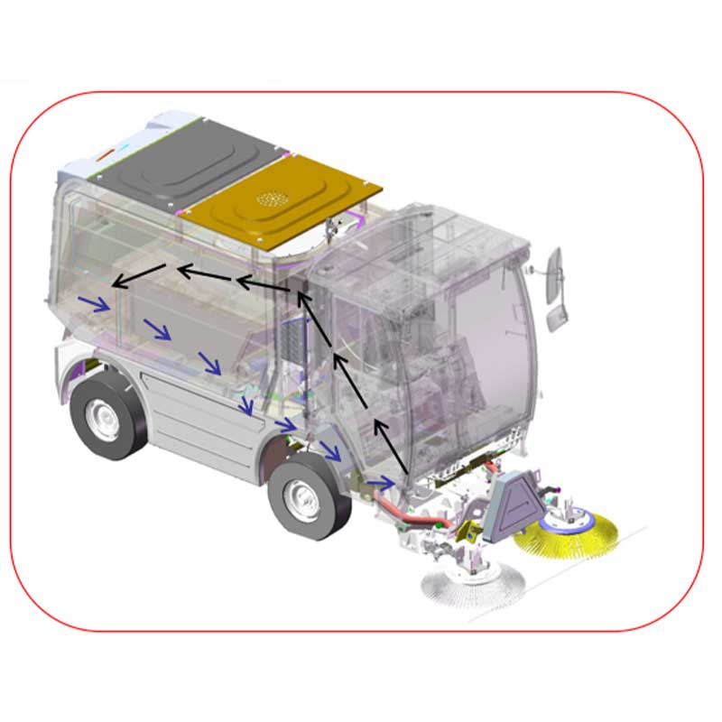 • 吸口上设置了风量调节板,根据路面的垃圾情况调节盖板的开度,以得到合适的风量和风速保证了较高的抽吸效率。