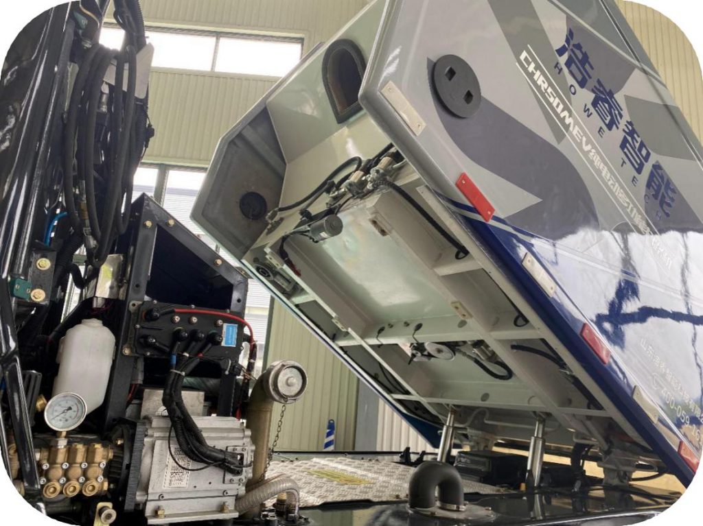 高压水系统以多功能清扫模式下分为两个功能具有箱内自清洗功能和高压喷枪功能。