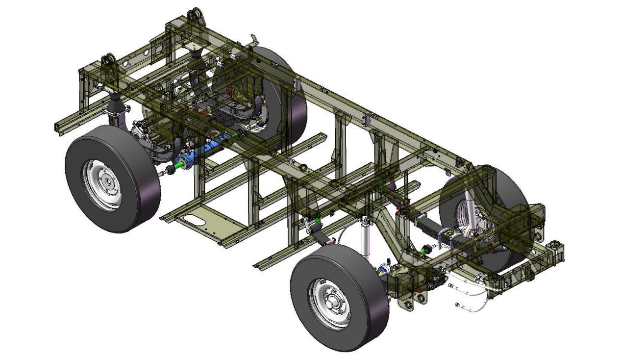车架是整车所有系统结构的承载连接体,车架为整体焊接式结构,主纵梁采用高强度的16Mn钢板而成。强度高,质量轻,结构简单。